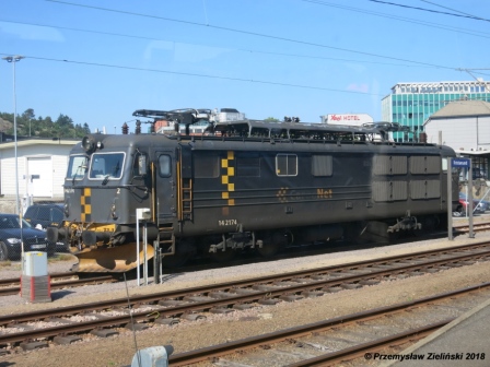 NSB locomotive 14 2167 at Kristiansand station. Class El.14 is derived from the Swiss class Ae6/6, and NSB owns these locomotives since 1968. Today they are used for freight traffic only; and their speed was decreased from 120 to 100 km/h.