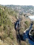Two Emus of Norwegian State Railways class 69 meet each other on the beautiful shore line 5 kilometres south of Downtown Oslo. The picture was taken 28.03.2003 - from a place which is not recommendable to persons suffering from vertigo!