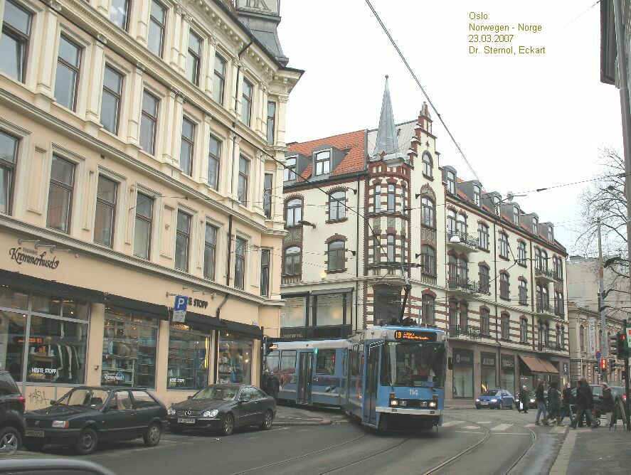 | IMG 5219 Oslo 23.03.07 Tram 114, Linie 19, kommt von der Endstelle Majorstuen durch die Bogstadsveien. Bis zur anderen Endstelle hinauf nach Ljabru sind es noch fast 40 Minuten zu fahren. Dr. Sternol, Eckart (Foto) |