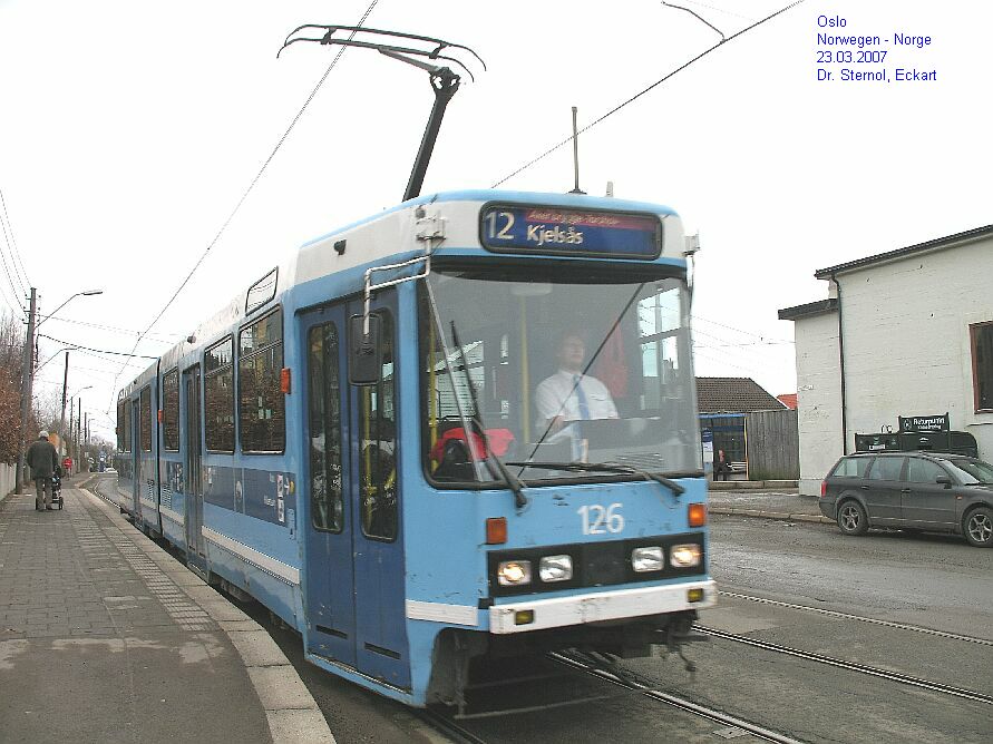 | IMG 5195 Oslo 23.03.07 Tram 126, Linie 12, hat Kjelsas erreicht. Nach Durchfahren der Wendeschleife geht es von der Hst, die rechts von der Trambahn zu sehen ist, ins Zentrum zurück. Dr. Sternol, Eckart (Foto) |