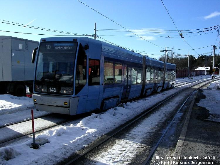 Oslo tram type SL95 no 146 on the suburban line Lilleakerbanen in western Oslo passing passing the outbound platform at Lilleaker on his way to Oslo City and Rikshospitalet. On the left a mobile rectifier unit.