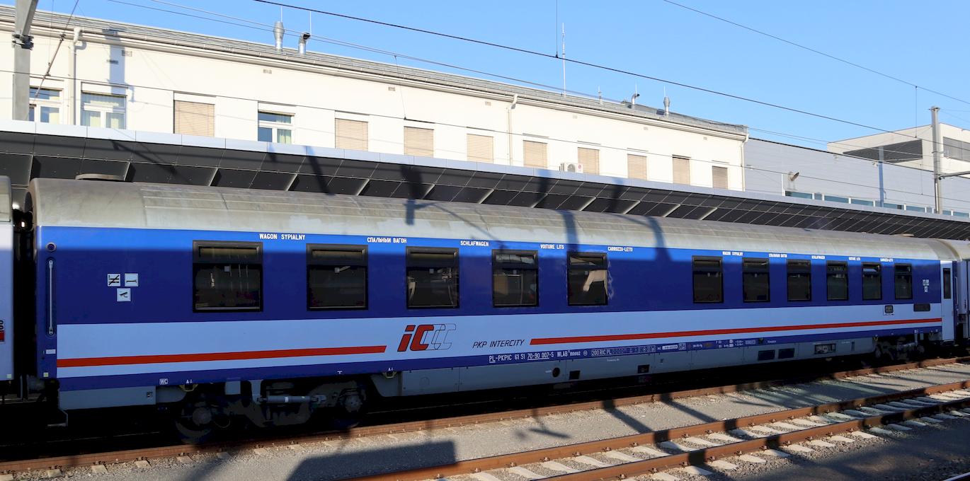 Sleeping-car of PKP-IC (WLABdmnu), seen in the consist of EN 349 "Jan Kiepura" (Frankfurt Hbf ---> Warszawa Wschodnia, via Köln and Duisburg, with through-cars to Minsk and Moskva-Belorusskaja).