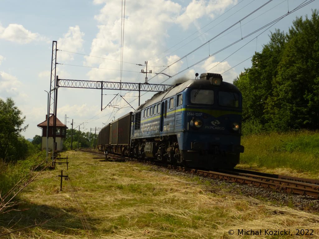 PKP Cargo ST44-1207 with a Black-Box-Xpress train to Walbrzych is leaving Rebiszow, Poland, 12.06.2022.