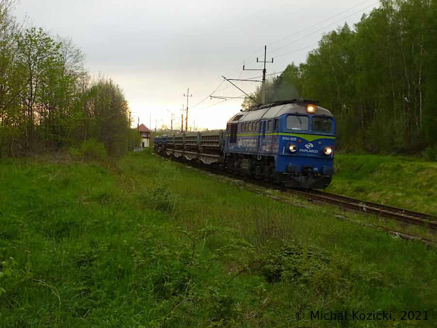 PKP Cargo ST44-1225 with a rake of empty gravel dumpers is leaving Rebiszow, Poland, 14.05.2021.