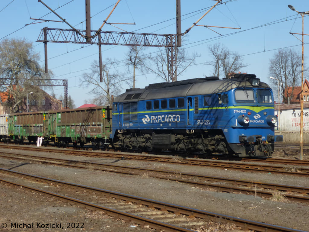 PKP Cargo ST44-1225 with a rake of private open wagons loaded with aggregate from Zareba is seen standing in Luban Slaski, Poland, 21.03.2022.