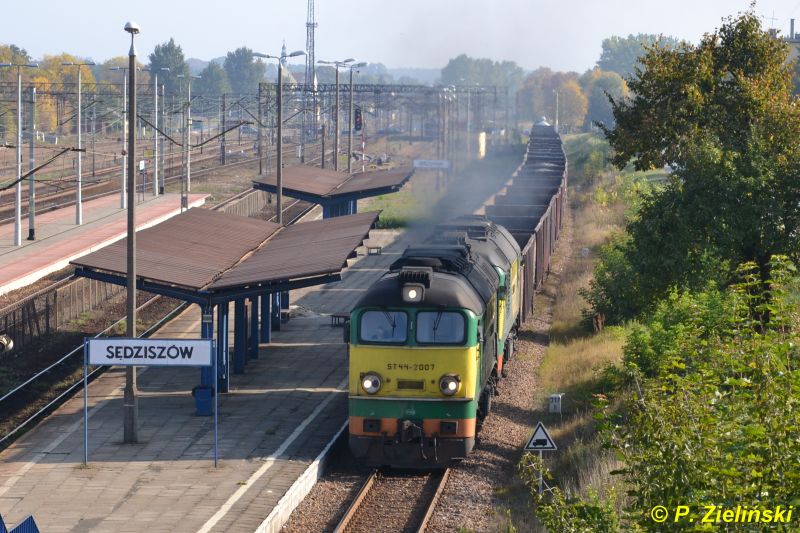 ST44-2007 +2011 with a cargo train on broad track on station Sêdziszów ; 30.09.11