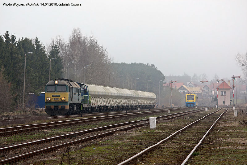 Polskie Koleje Panstwowe (PKP Cargo) ST44-992+SM42-1128 with a freight train Gdynia Port - Gdansk Osowa and SA109-006 as a passenger train Koscierzyna - Gdynia Glowna (right side) 14.04.2010, Gdansk Osowa Photo W. Kolins |