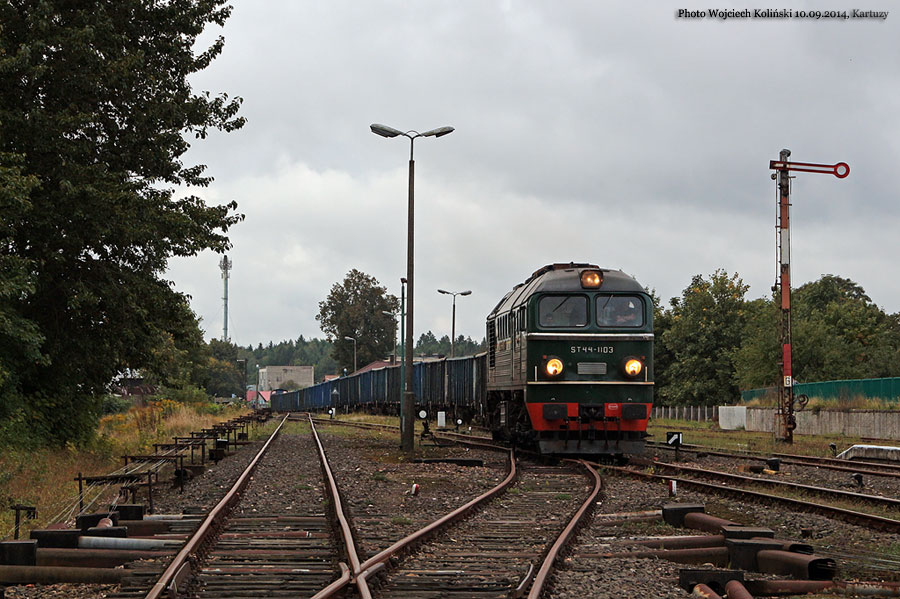 Polskie Koleje Panstwowe (PKP Cargo) ST44-1103 with a freight train Borow - Kartuzy - Stara Pila SM42-1001 at the end of train 10.09.2014, Kartuzy Photo W. Kolins |
