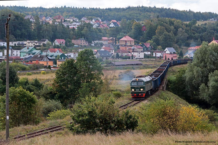 Polskie Koleje Panstwowe (PKP Cargo) ST44-1103 with a freight train Borow - Kartuzy - Stara Pila SM42-1001 at the end of train 10.09.2014, track Somonino - Leszno Kartuskie Photo W. Kolins |
