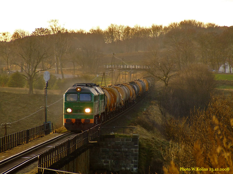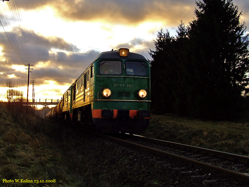 Polskie Koleje Panstwowe (PKP) ST44-1282+1102 with a freight train Pulawy Azoty - Gdynia Port 23.12.2008, track Borkowo - Zukowo Wschodnie Photo W. Kolins |