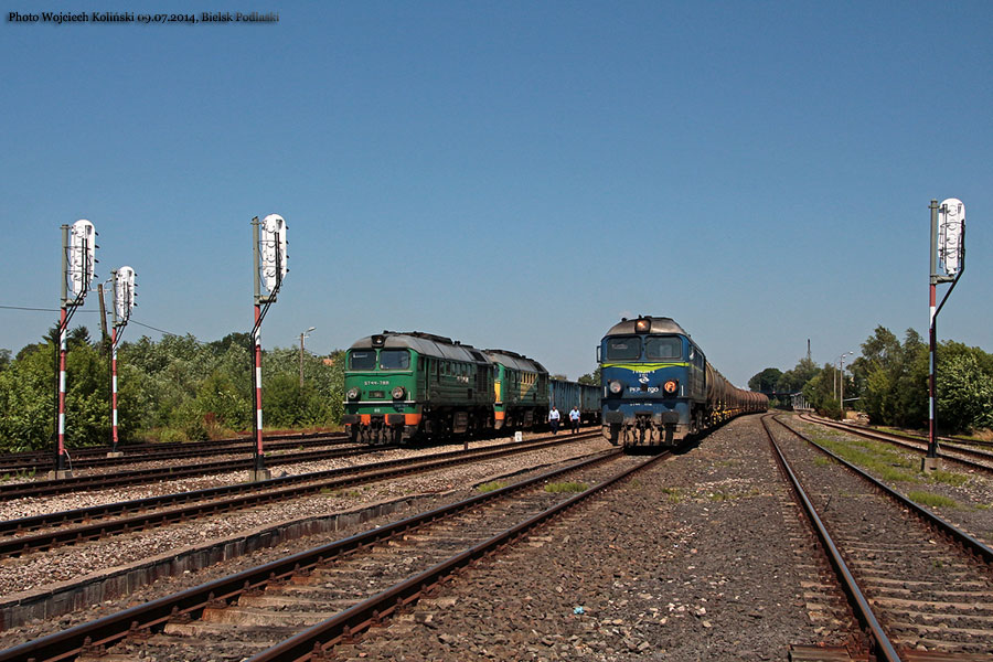 Polskie Koleje Panstwowe (PKP Cargo) ST44-788+358 with a freight train Bialystok - Warszawa Glowna Towarowa, and ST44-1112 (blue) with a freight train Kuznica Bialostocka - Miedzylesie 09.07.2014, Bielsk Podlaski Photo W. Kolins |