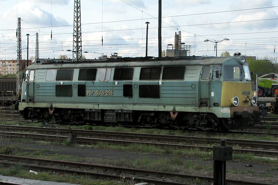 PKP Class SU45 Diesel Locomotive. SU45-255 has just uncoupled from train RB5984 (13:25 arrival from Poznan Gl) at Frankfurt (Oder) on Friday May 9th, 2003.