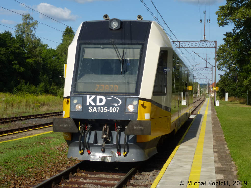 KD SA135-007 is seen waiting at Stara Kamienica for a crossing train, Lower Silesia, Poland, 09.08.2019.