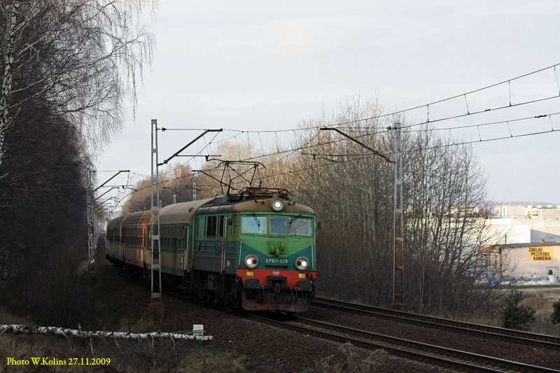 Polskie Koleje Panstwowe (PKP) EP07-339 with a fast train "Gryf" Szczecin - Olsztyn 27.11.2009, track Wejherowo Smiechowo - Reda Pieleszewo Photo W. Kolins |