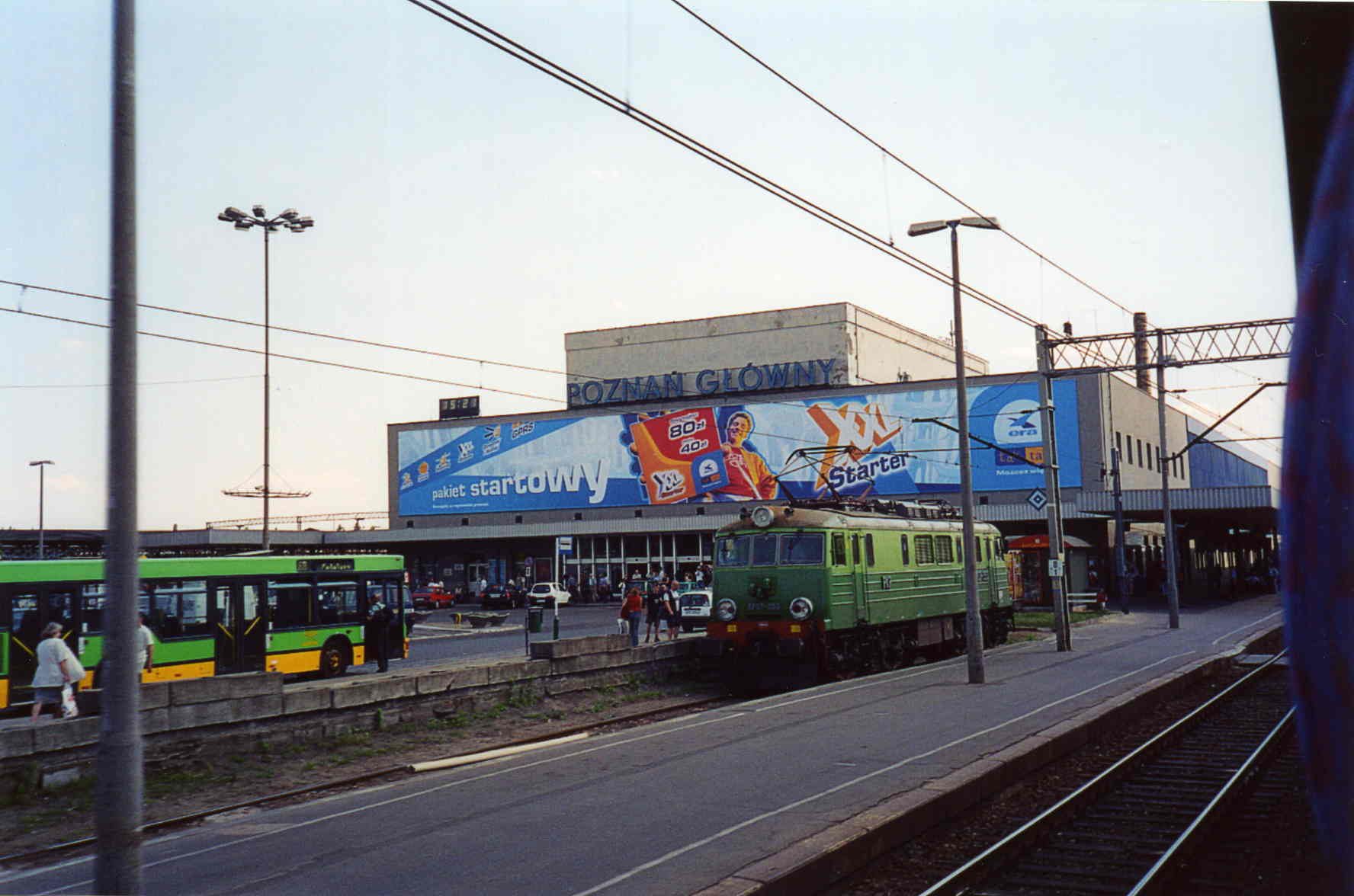 PKP station Poznan Glowny with locomotive EP07 250 and a city bus.
