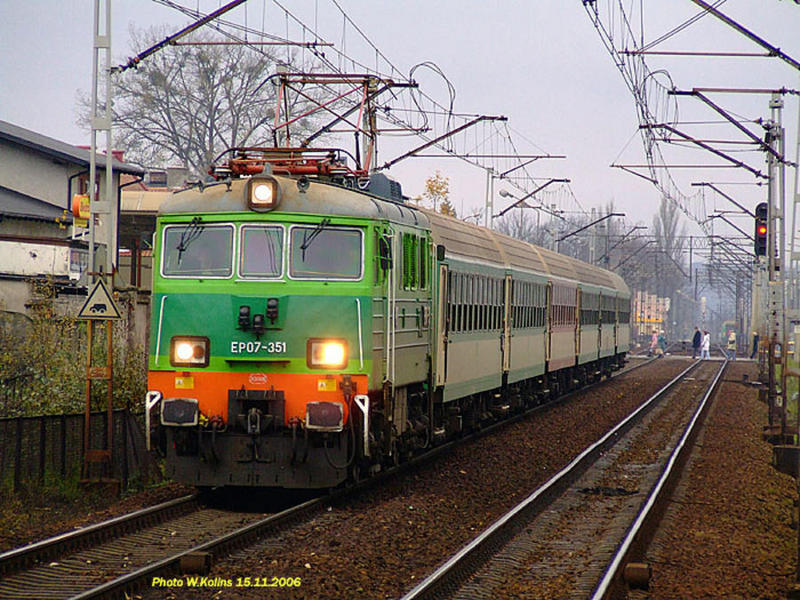 Polskie Koleje Panstwowe (PKP) EP07-351 with a fast train "Rybak" Bialystok - Szczecin 13.11.2007, track Reda Pieleszewo - Wejherowo Smiechowo Photo W. Kolins |
