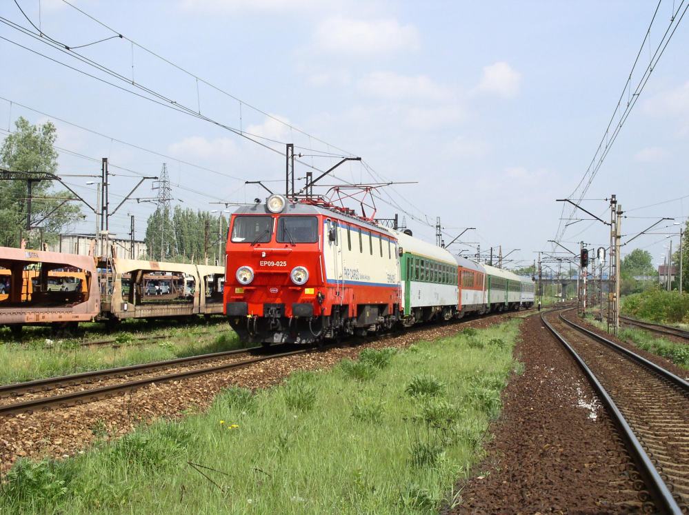 The train EC 106 "Praha" from Warszawa Wschodnia to Praha hl.n., headed by EP09-025, passing through Tychy station. 2006-05-18