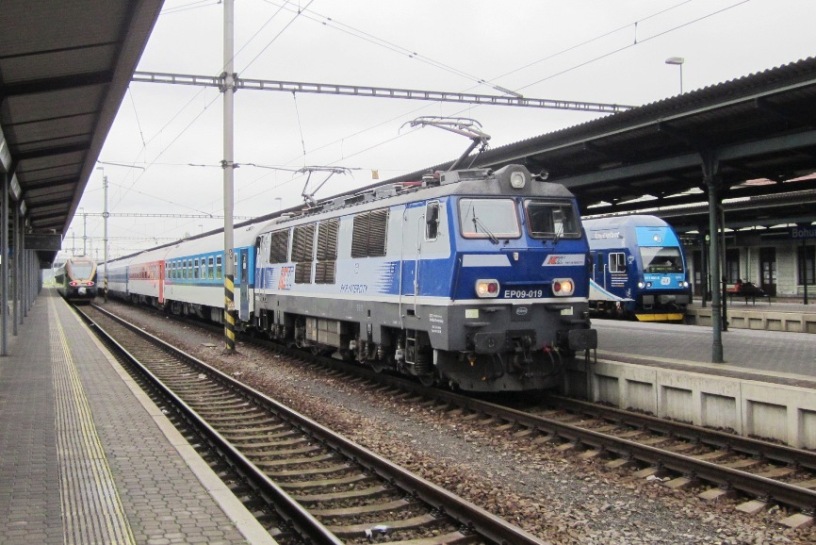 EP09-017 with an EC PRAHA train to Praha ; station Katowice - 31.01.13 ;