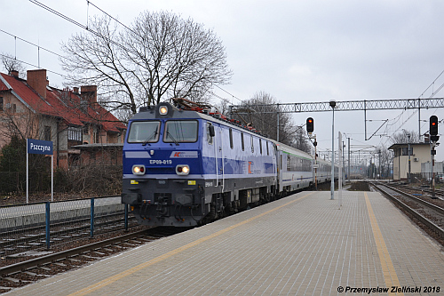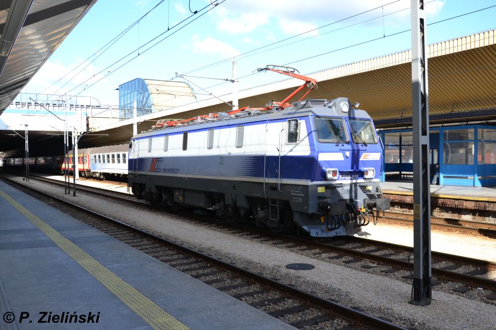 PKP IC EP09-018 is seen at station Poznan Gl., Poland, 10.10.2019.