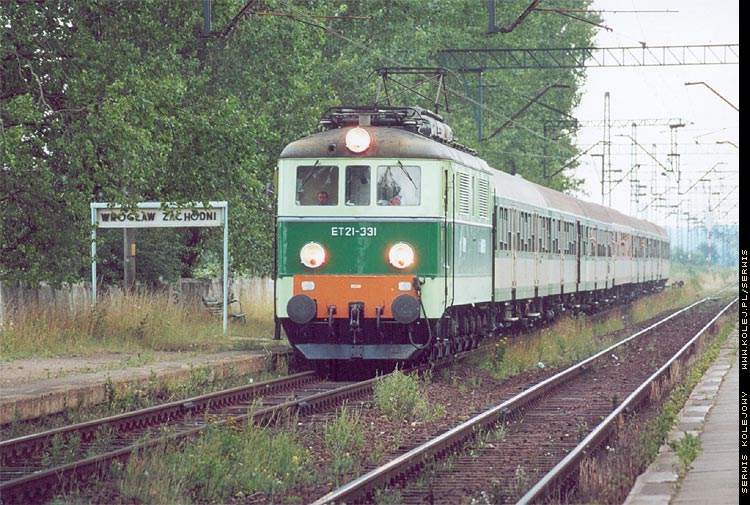 Locomotive ET21-331 with passenger train from Jelenia Gora to Wroclaw Glowny nr 220 pictured in Wroclaw Zachodni (2002.07.16)