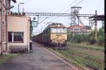 Polish electric locomotive (based on Russian one), ET21-429 with passenger train 'Bieszczady' from Krynica (and Zagorz) to Gliwice, reaches Nowy Sacz station (August 13, 1997).