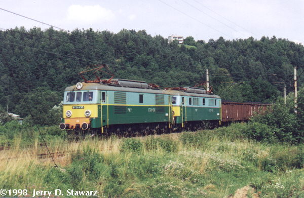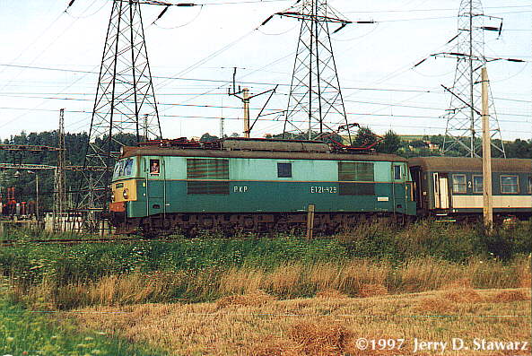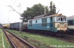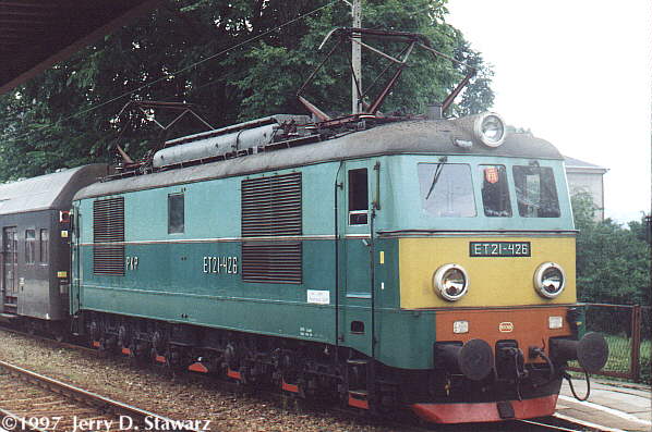 Electric freight locomotive ET21-426 (Mother Depot: Jaslo), with a double-decker set, as a passenger train from Stroze to Jaslo, before start the route. (July 23, 1997)