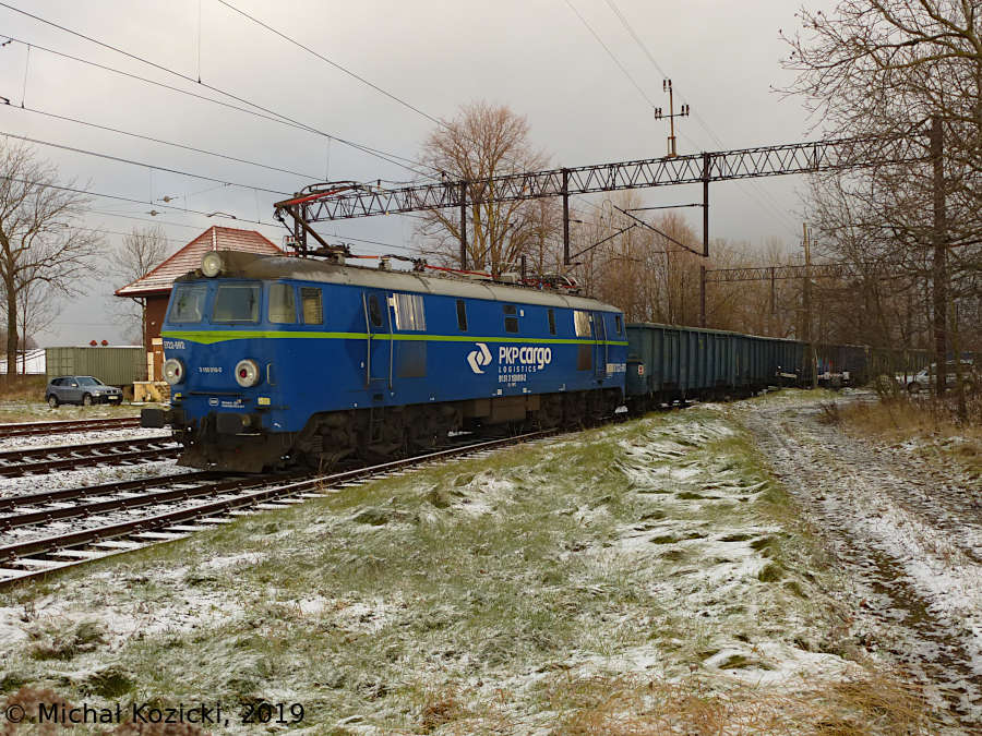 PKP Cargo ET22-592 is leaving Rebiszow at the rear end of the freight train towards Wegliniec, Poland, 03.12.2019.