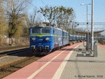 PKP Cargo ET42-025 with a rake of Black-Box-Xpress containers is seen standing in Rebiszow for allowing two passenger trains to pass, Poland, 16.03.2021.