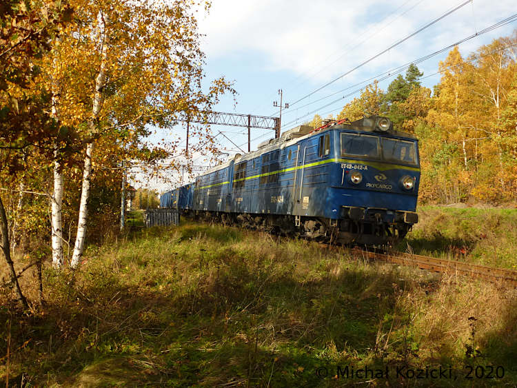 PKP Cargo ET42-042 with a culm train is seen leaving Rebiszow, Poland, 26.10.2020.