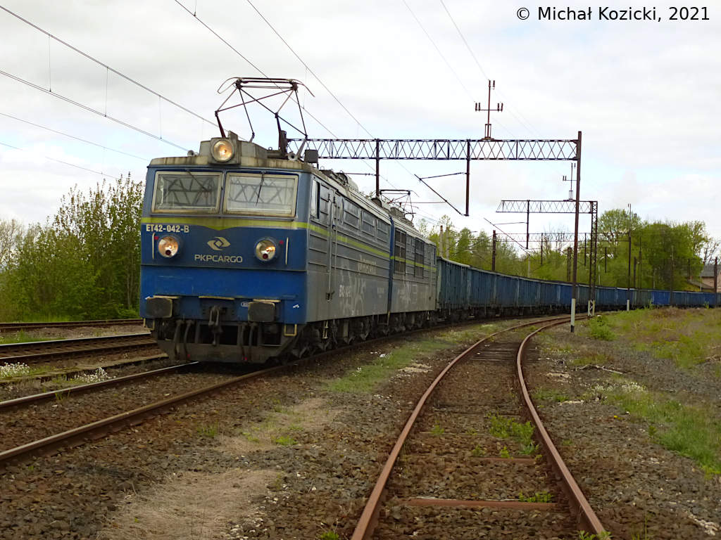 PKP Cargo ET42-047 with a long train of open wagons is waiting in Rebiszow for a crossing train to pass, Poland, 05.05.2022.