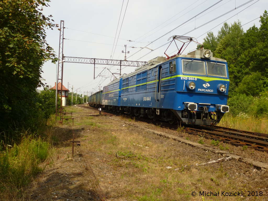 PKP Cargo ET42-044 with a culm train is leaving station Rebiszow, Poland, 21.07.2018.