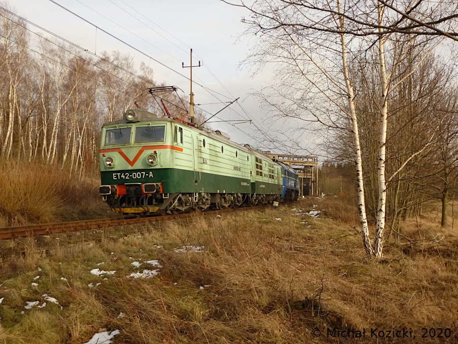 PKP Cargo ET42-007 in the old colours is heading for Jelenia Gora with a culm train, Rebiszow, Poland, 29.02.2020.