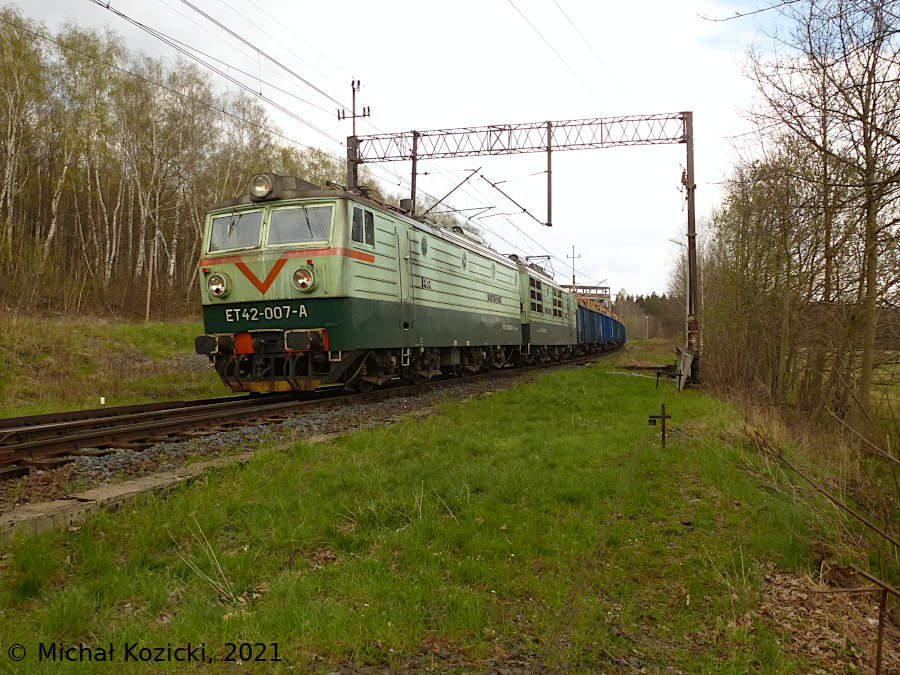 PKP Cargo ET42-007 with a rake of open wagons loaded with timber is passing Rebiszow, Lower Silesia, Poland, 29.04.2021.