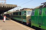 Two passenger trains at Krzyz station, one (bound for Kostrzyn) hauled by SU45 245 and the other hauled by EU07 409. The EU07's electric train heating cable is about to be attatched to the train, so the pantographs are lowered.