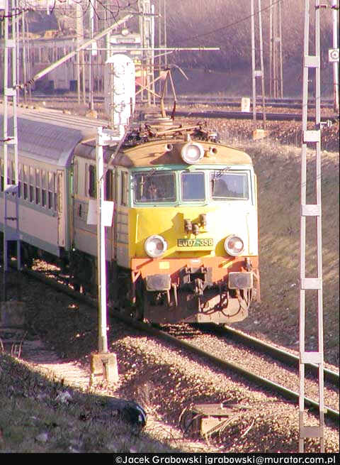 Electric universal locomotive EU07-362 with the fast passenger train 'Motlawa' from Gdynia Glowna Osobowa to Olsztyn Glowny, waiting before leaving Gdynia. (January 24, 1998)