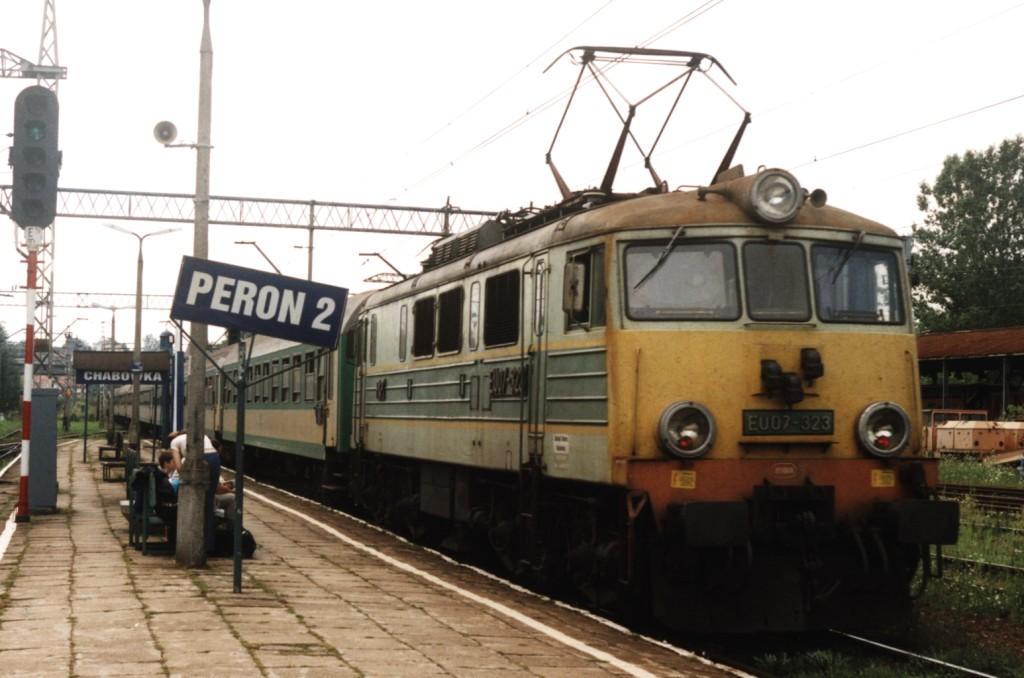 Locomotive EU07-323 with train EX32400 Zakopane-Lublin at the railway station of Chabówka on 8-8-2001. Photo and scan by Date Jan de Vries (datedevries@hotmail.com). |