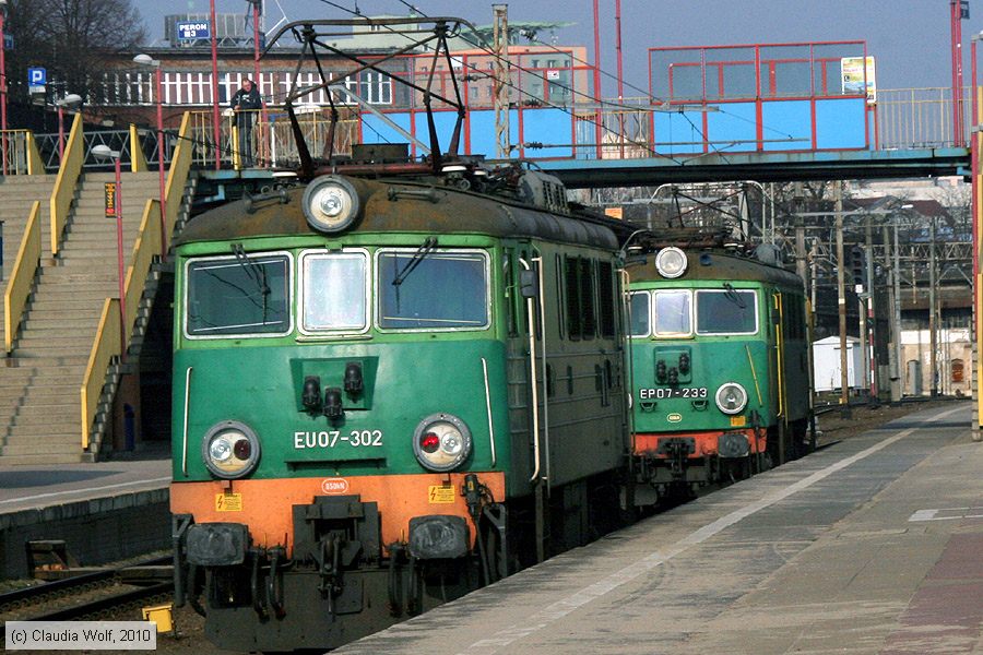 PKP - EU07-302 Lok EU07-302 (links) und EP07-233 (rechts im Bild) im Bahnhof Szczecin Główny am 18. März 2010.