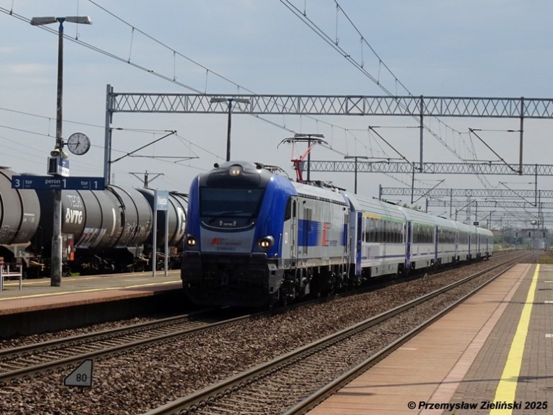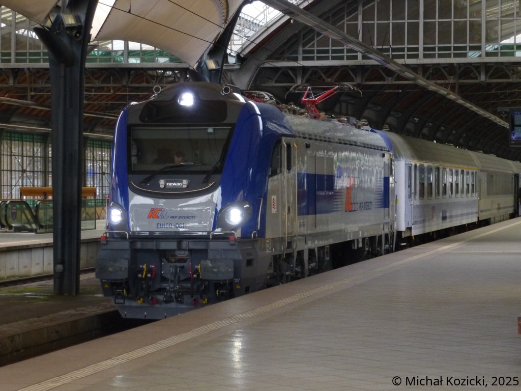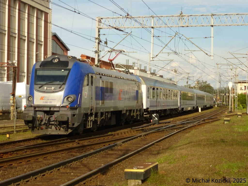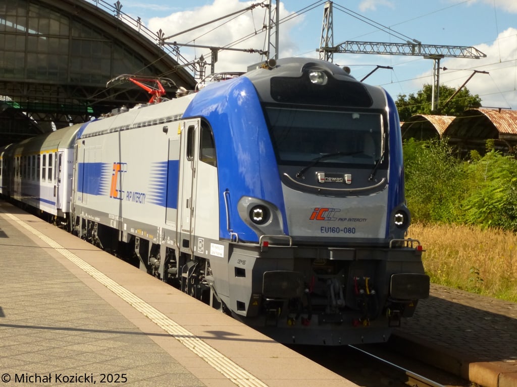 PKP IC EU160-080 will depart from Wroclaw Gl. on the TLK "Kossak" service from Kolobrzeg to Krakow, Poland, 30.08.2025.