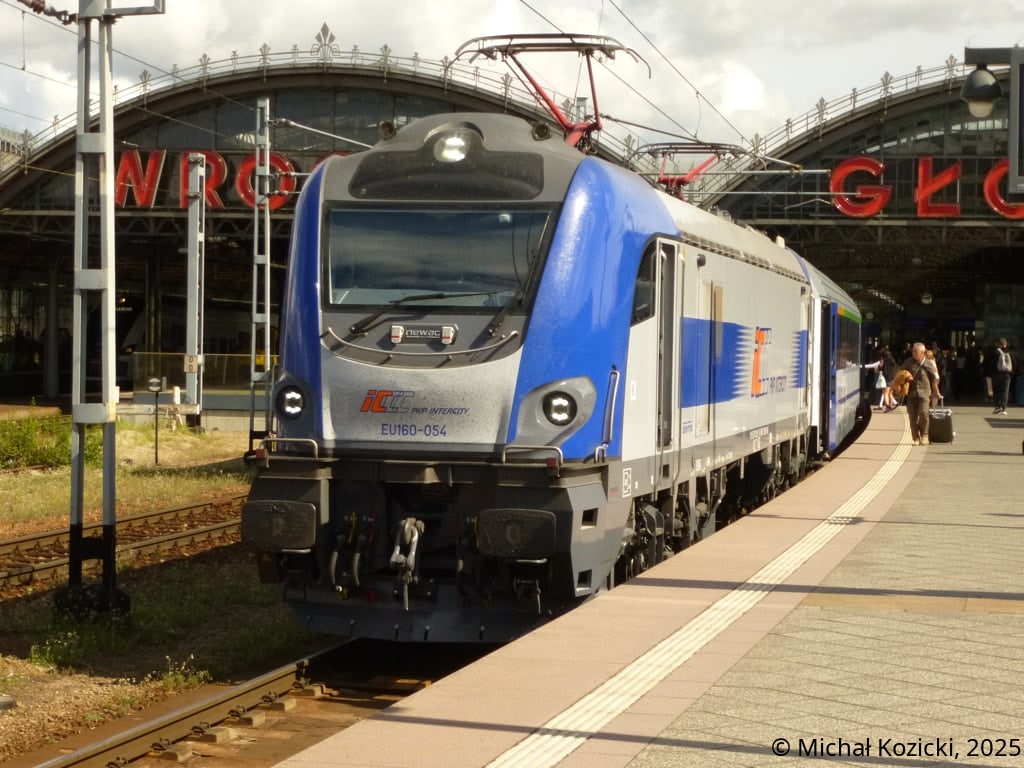 PKP IC EU160-054 will depart from Wroclaw Gl. on the IC "Orzeszkowa" service from Warsaw to Szklarska Poreba, Poland, 30.08.2025.