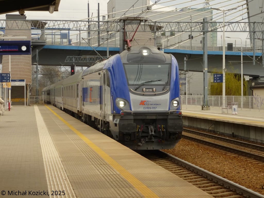 PKP IC EU160-057 is stopping at Krakow Plaszow with IC "Szkuner" from Przemysl to Ustka, Poland, 24.03.2025.