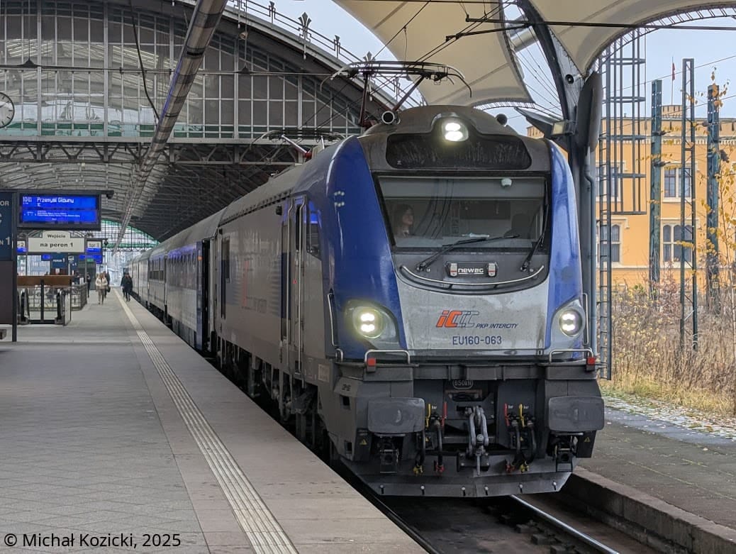 PKP IC EU160-063 makes a stop at Wroclaw Gl. on the IC "Falat" service from Poznan to Przemysl, Poland, 20.12.2025.