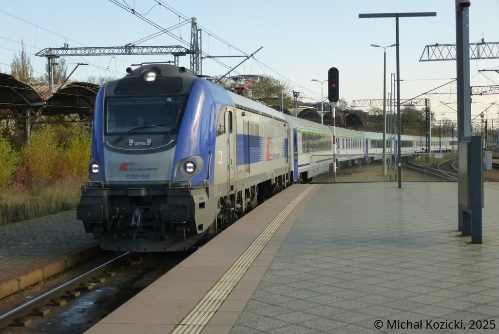 PKP IC EU160-069 with IC "Zefir" from Przemysl to Ustka is stopping in Wroclaw Gl., Poland, 08.11.2025.
