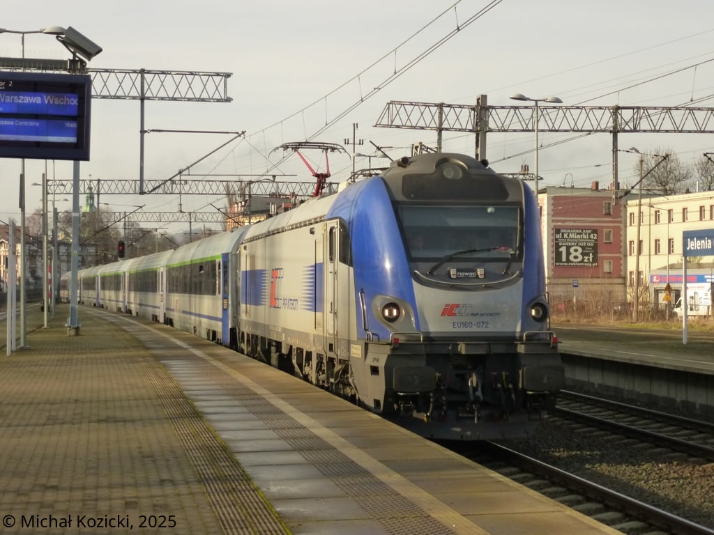PKP IC EU160-072 is arriving in Jelenia Gora on the IC "Orzeszkowa" service from Szklarska Poreba to Warsaw, Poland, 14.12.2025.