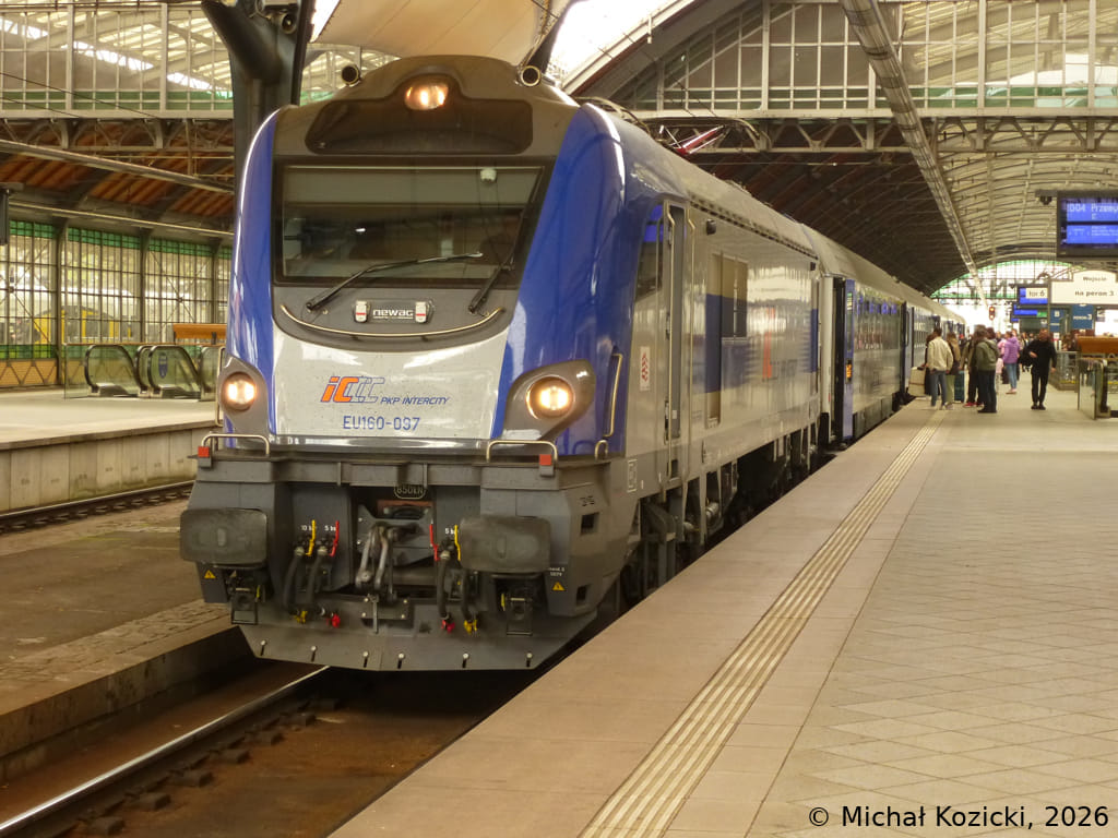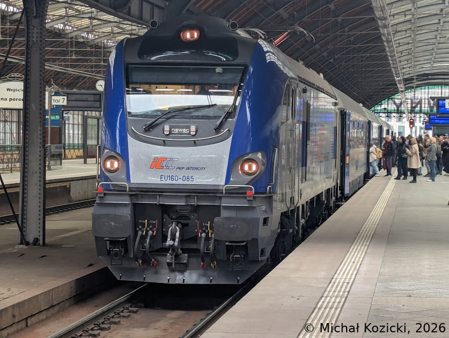 PKP IC EU160-085 will depart from Wroclaw Gl. on the IC "Mehoffer" service from Szczecin to Przemysl, Poland, 19.04.2026.