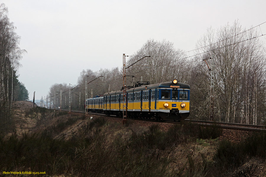 Szybka Kolej Miejska (SKM Trojmiasto) EN57-1758 as a passenger train "Sprinter" Gdynia Glowna - Slupsk and EN57-1828+1102 as a passenger train Gdansk Srodmiescie - Wejherowo, a broken network above the train 25.03.2016, track Wejherowo Smiechowo - Reda Pieleszewo |