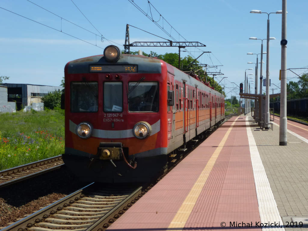 PolRegio EN57-694 is stopping at Poznan Krzesiny on a service from Lodz Kaliska to Poznan Gl., Poland, 09.06.2019.