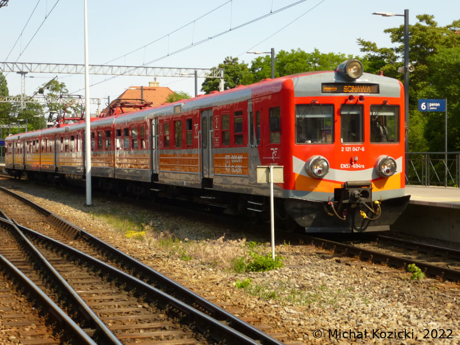 Koleje Slaskie EN57-673 hired from PolRegio will depart from Czestochowa on a S13 service to Lubliniec, Poland, 21.05.2022.