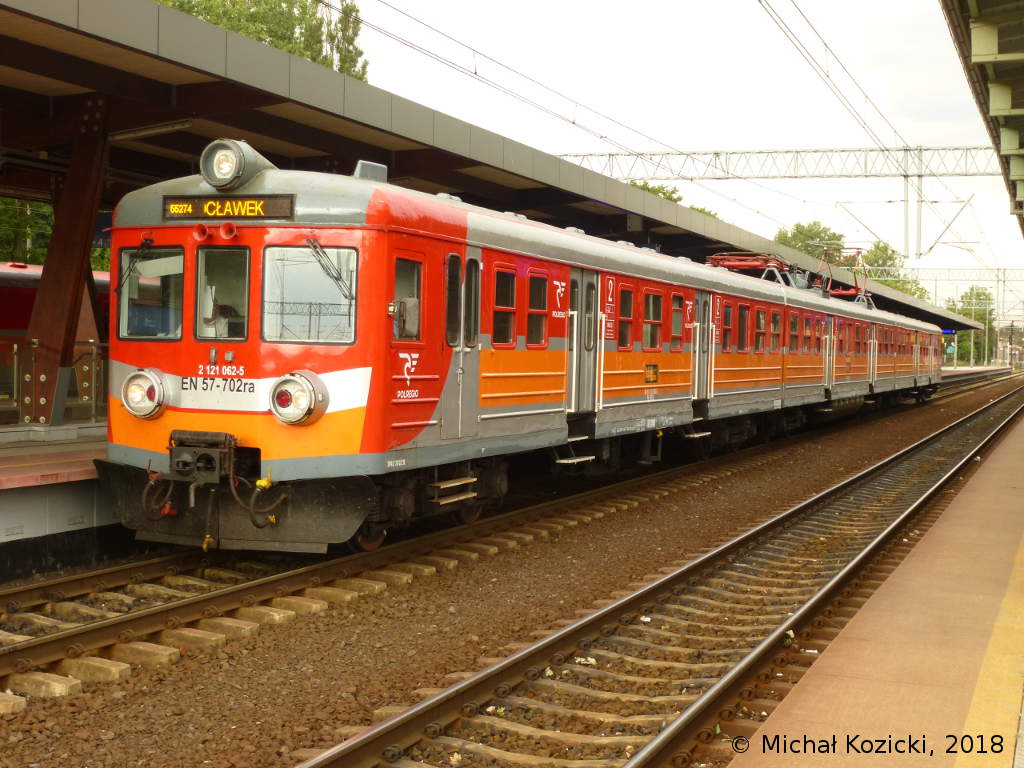 PolRegio EN57-702 is stopping at Torun Gl. on a service from Bydgoszcz to Wloclawek, Poland, 10.07.2018.