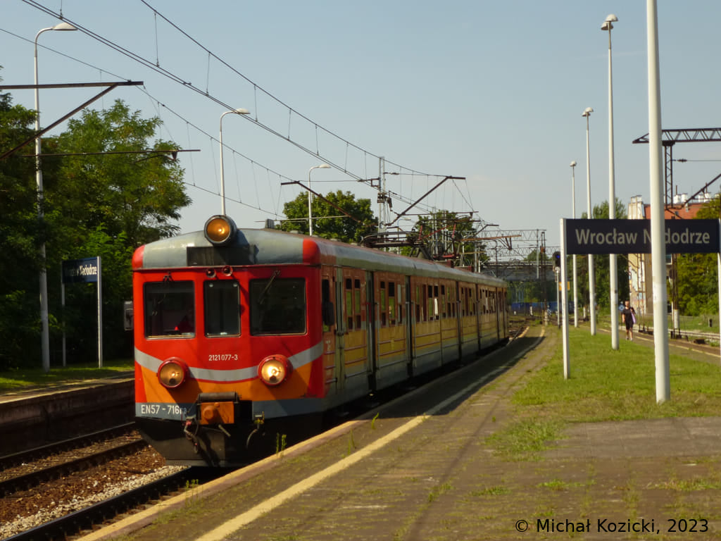 PolRegio EN57-716 is stopping at Wroclaw Nadodrze on a service to Lubliniec, Poland, 14.08.2023.