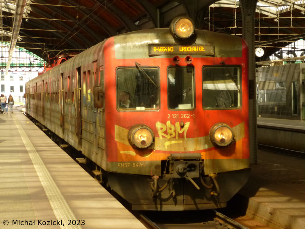 PolRegio EN57-847 has reached its final station Wroclaw Gl. on a service from Lubliniec, Poland, 30.04.2023.